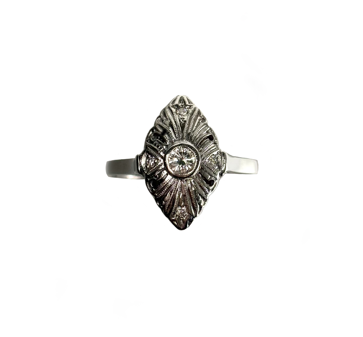 Tento prsten z bílého zlata nese znaky secesního nebo art deco stylu. Dominantní oválný motiv je bohatě zdoben reliéfním rytím, které připomíná sluneční paprsky, a ve svém středu ukrývá čirý kulatý briliant. Jemné detaily dodávají šperku noblesní vzhled a dávku historického šarmu.