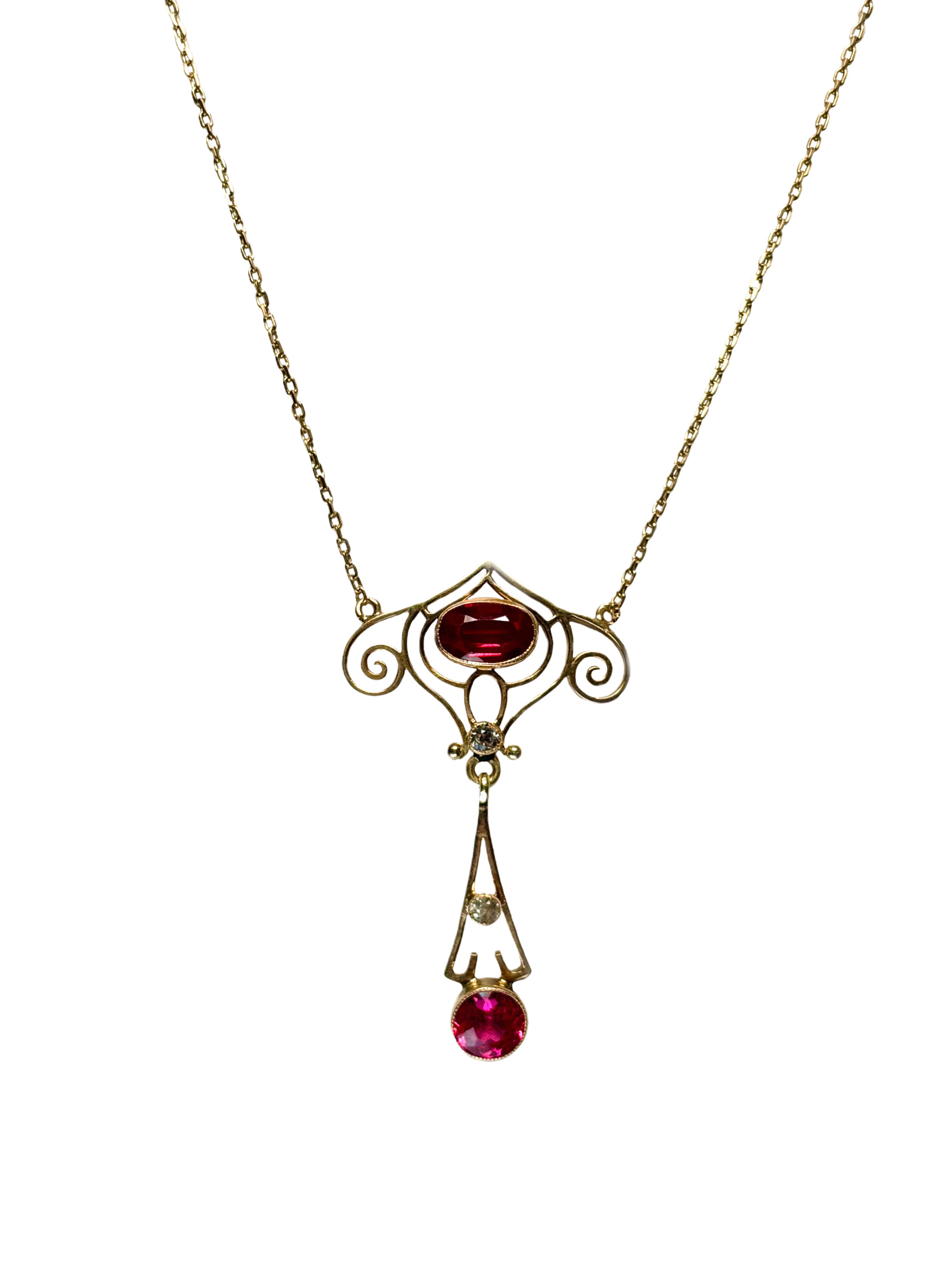 Tento nádherný náhrdelník je zlatnickým uměleckým dílem s retro nádechem, který čerpá inspiraci ze secesního stylu. Přívěsek má propracovaný ornamentální tvar se zakřivenými liniemi a je ozdoben dvěma výraznými syntetickými rubíny a dvěma menšími brilianty (routy). Ručně zpracované detaily a visací část přívěsku dodávají šperku lehkost i výraznost.