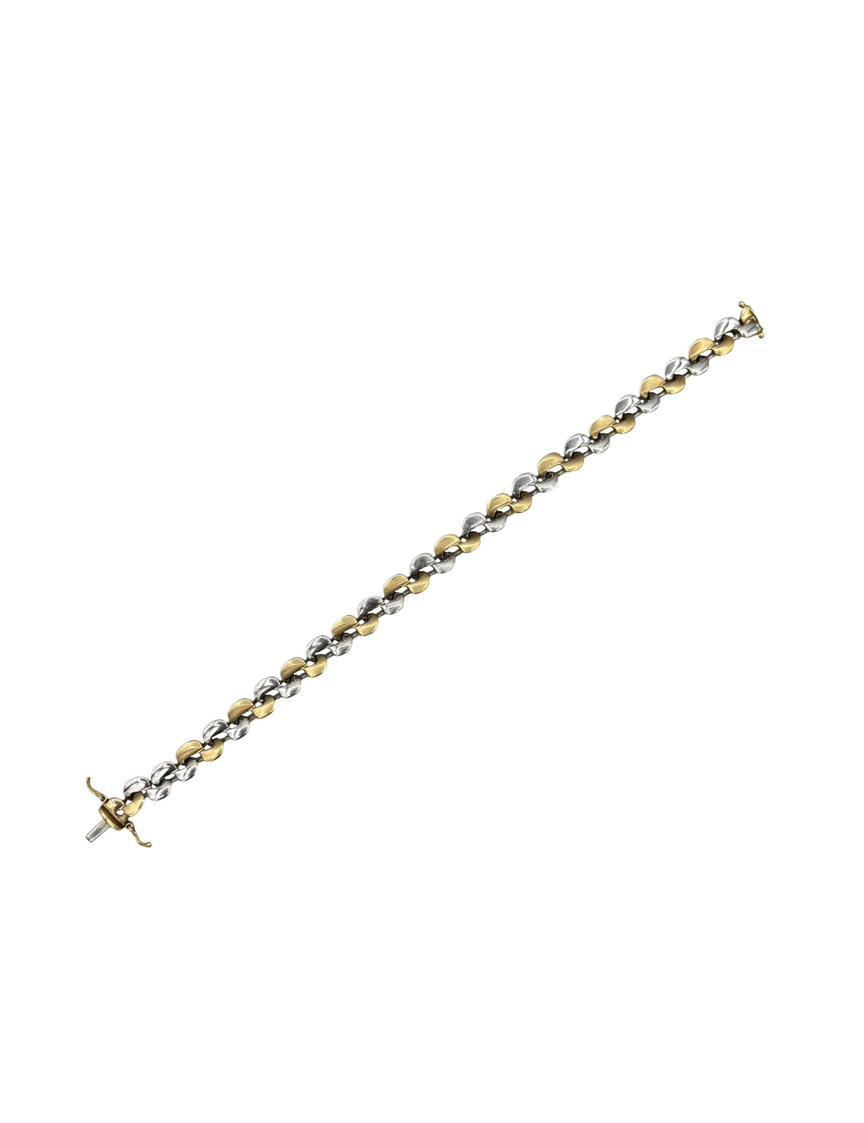 Moderní náramek vyrobený z kombinace žlutého a bílého zlata. Článková konstrukce střídající oba odstíny zlata vytváří elegantní kontrast a zajišťuje pohodlné nošení. Díky nadčasovému designu je tento šperk ideálním doplňkem pro každodenní i slavnostní příležitosti.