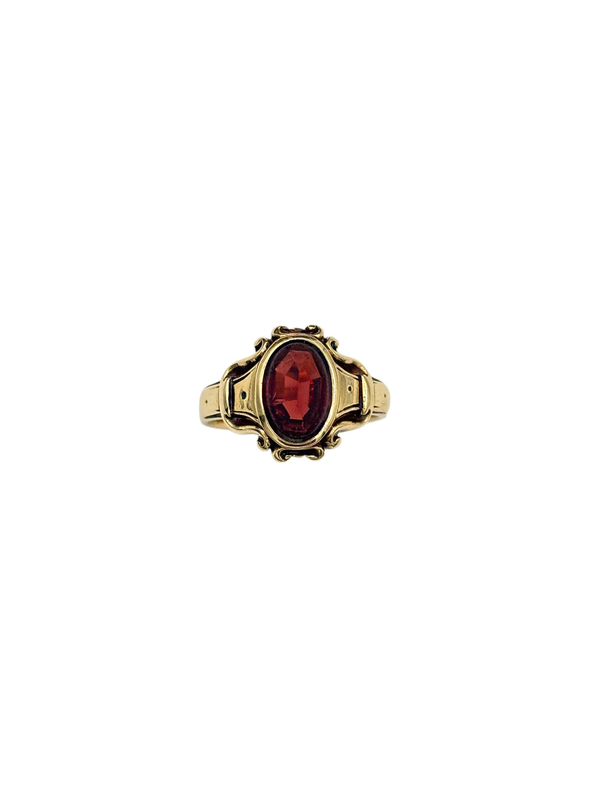 Výrazný prsten ze žlutého zlata zdobený oválným almandinem sytě červené barvy. Kámen je zasazen do bohatě tvarovaného rámečku s historizujícím dekorem, který připomíná secesní nebo barokní šperky. Tento jedinečný kousek osloví milovníky výrazných a romantických šperků s nádechem minulosti.