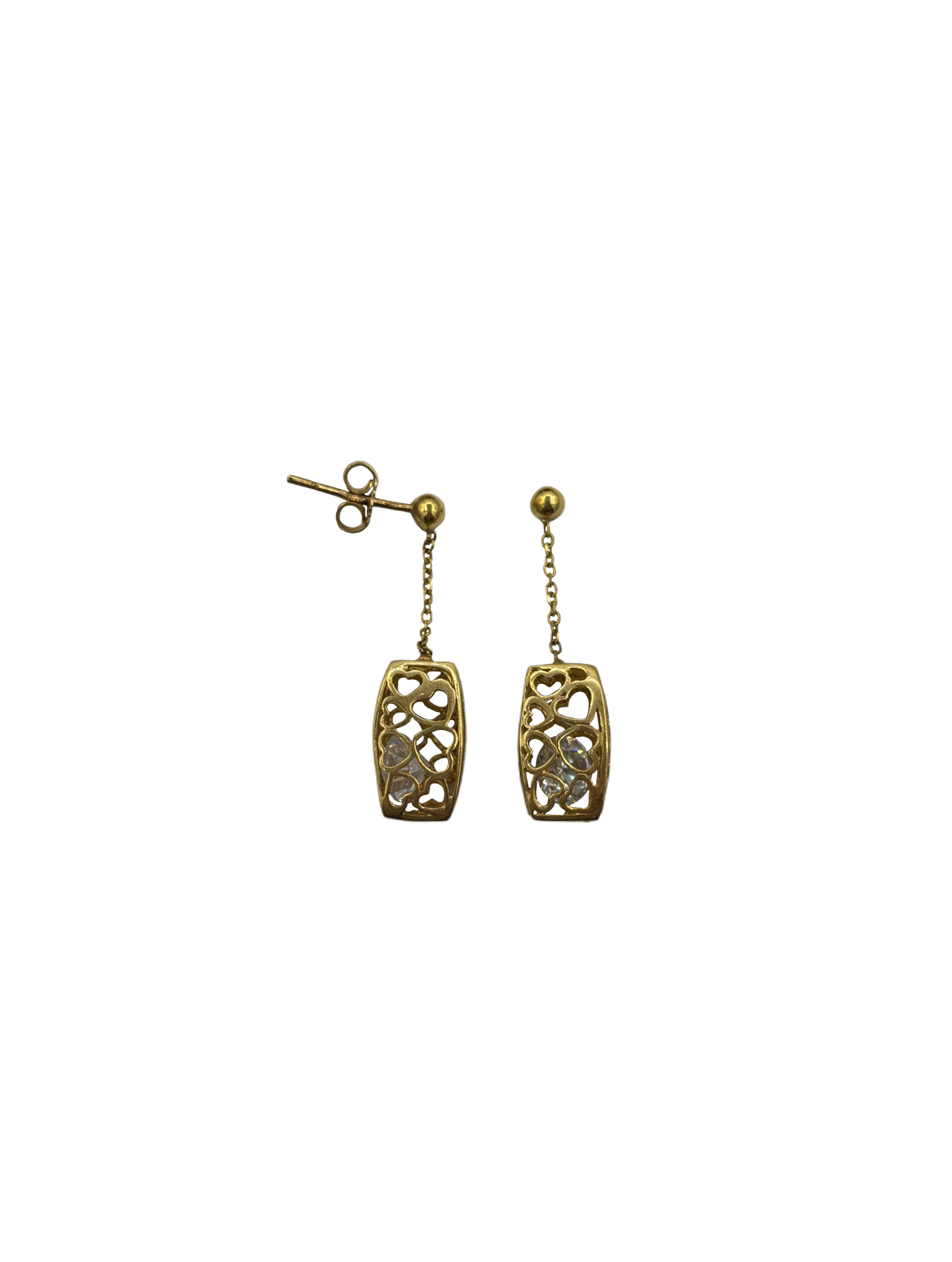 Jemné visací náušnice ze žlutého zlata s elegantním košíkovým vzorem, jehož vnitřek zdobí třpytivý zirkon. Lehké řetízkové zavěšení dodává šperku vzdušnost a pohyb, zatímco motiv srdíček v mřížce působí romanticky a ženský. Ideální volba pro každodenní nošení i jako jemný dárek s osobním kouzlem.