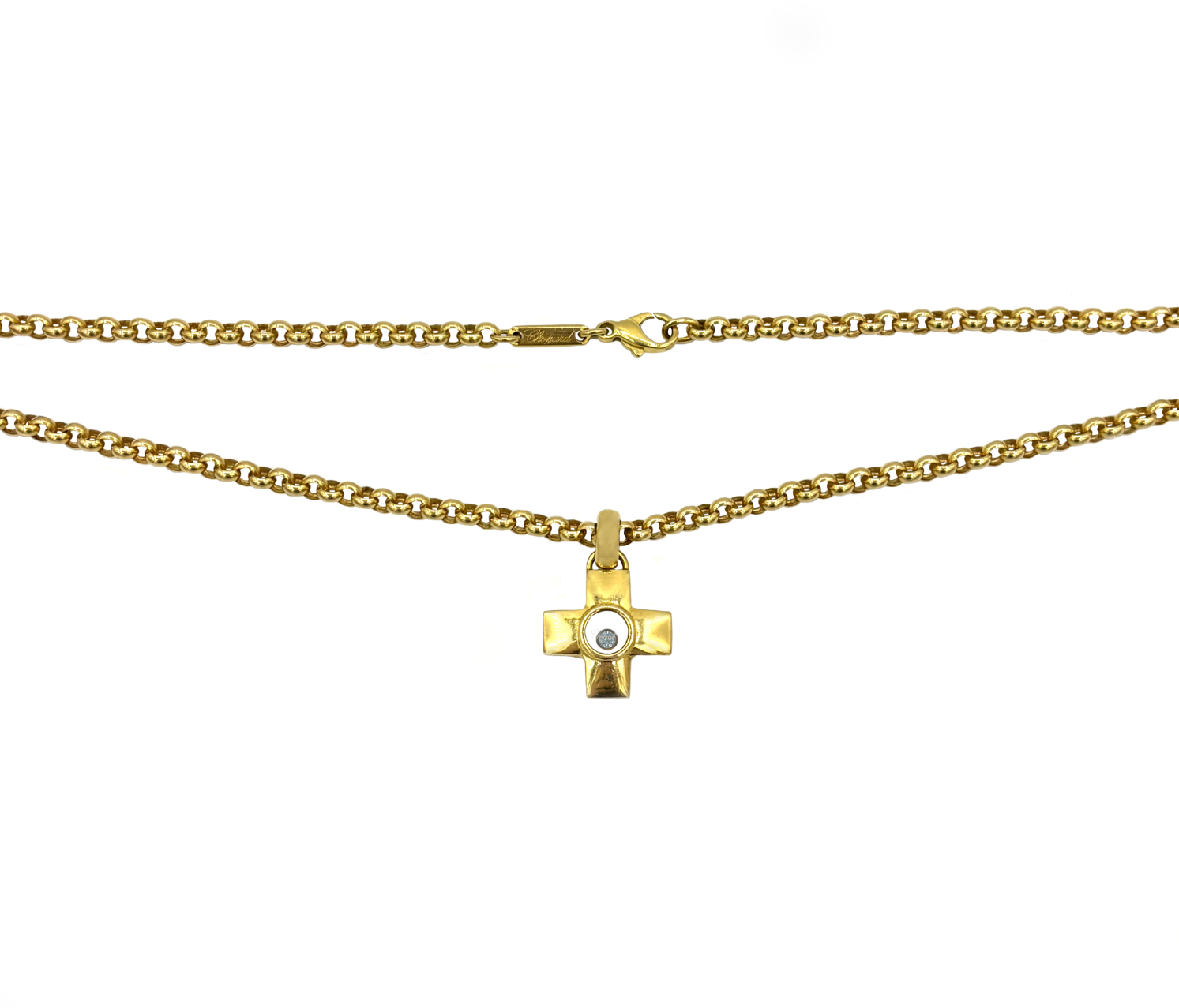 Luxusní náhrdelník od světoznámé švýcarské značky Chopard vyniká precizním zpracováním a elegantním designem. Přívěsek ve tvaru kříže s centrálně zasazeným diamantem dodává šperku symbolický význam a jemný třpyt. Ideální volba pro každodenní nošení i jako výjimečný dárek. Díky své decentní eleganci se hodí k jakémukoli outfitu.