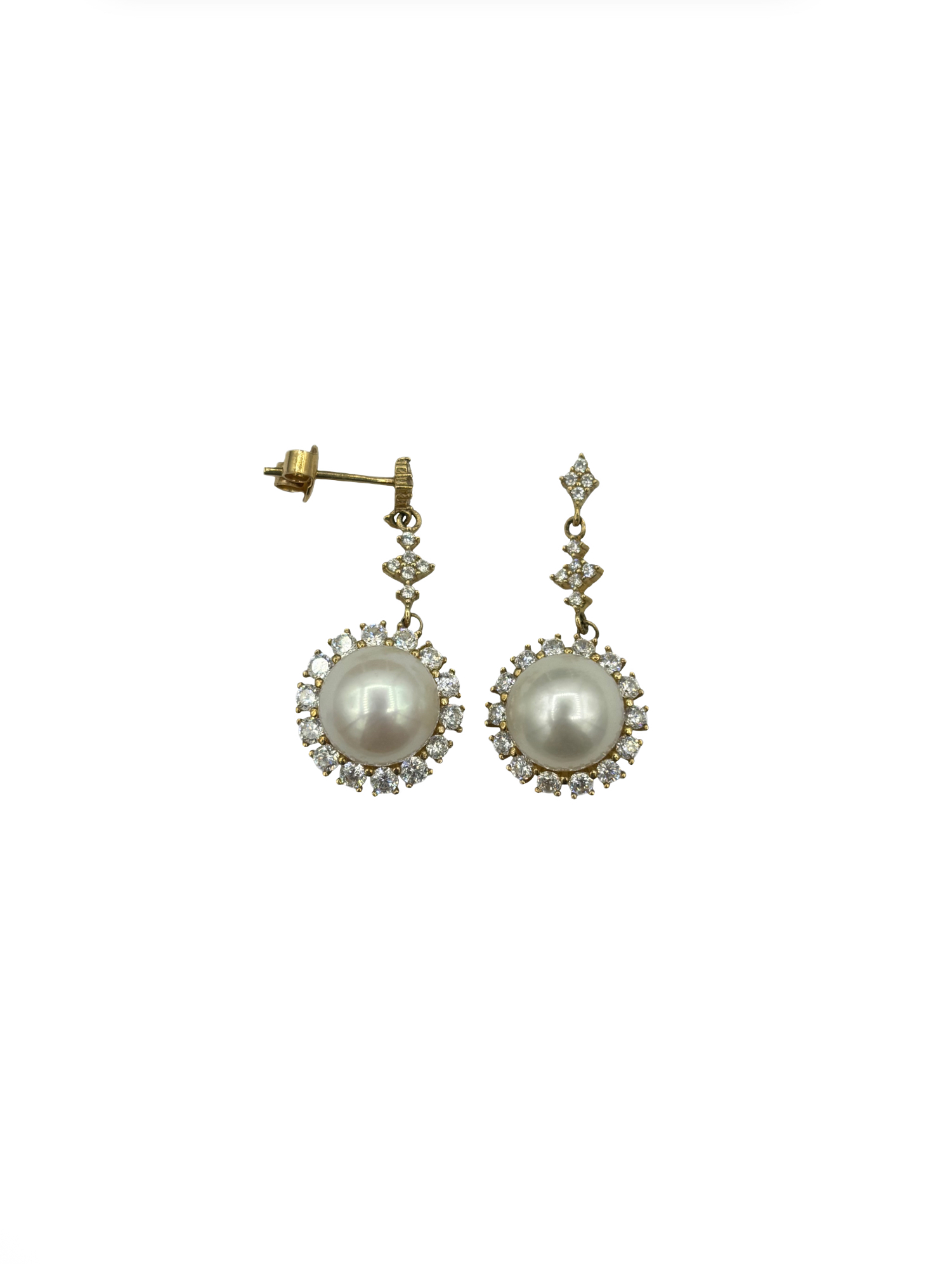 Visací náušnice ze žlutého zlata s jemnou bílou perlou a čirým zirkonem zasazeným v dekorativním košíčku. Kombinace lesku a elegance, která se hodí pro slavnostní i každodenní nošení. Pohodlné zapínání zajišťuje bezpečné držení.