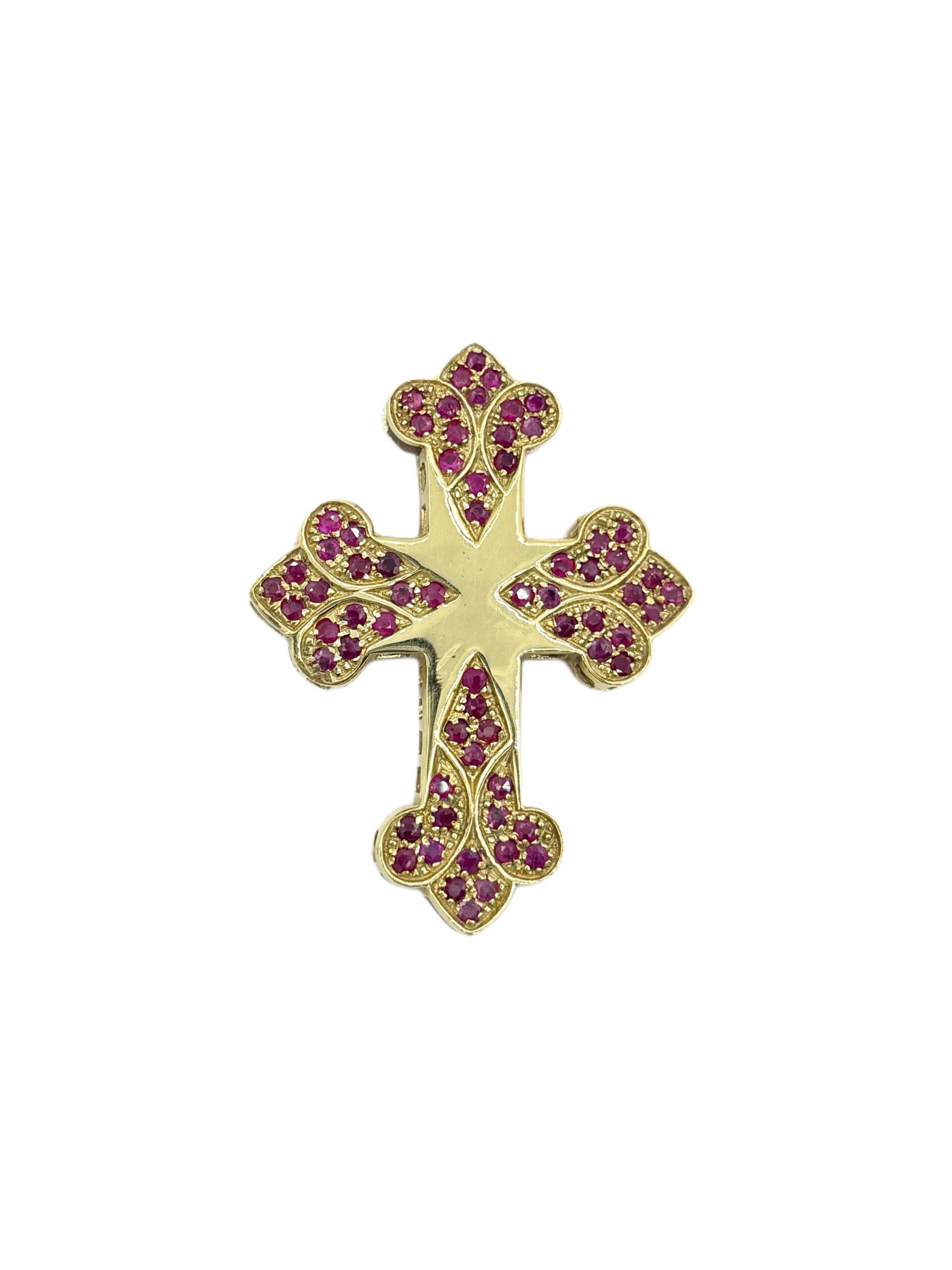 Přední strana kříže je žluté zlato osazené drobnými rubíny, které mu dodávají bohatý a zářivý vzhled. Zadní strana je z bílého zlata s jemným prolamovaným ornamentálním vzorem, působící vzdušně a elegantně.