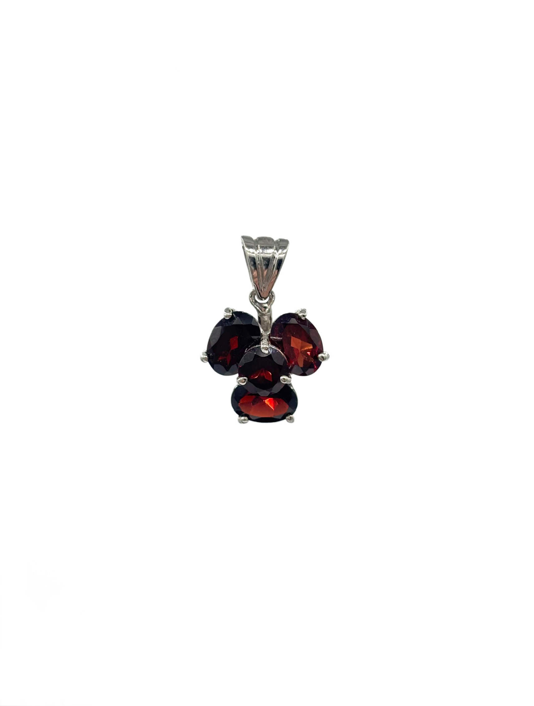 Okouzlující přívěsek z bílého zlata zdobený čtveřicí oválných almandinů, jejichž hluboký vínově červený odstín vytváří elegantní květinový motiv. Kameny jsou usazeny do čtyřkrapnových úchytů a tvoří pravidelný tvar čtyřlístku. Přívěsek působí jemně, přesto výrazně a díky syté barvě je skvělým doplňkem jak k formálnímu, tak i každodennímu outfitu. Závěs ve tvaru vějířku doplňuje šperk o elegantní detail.