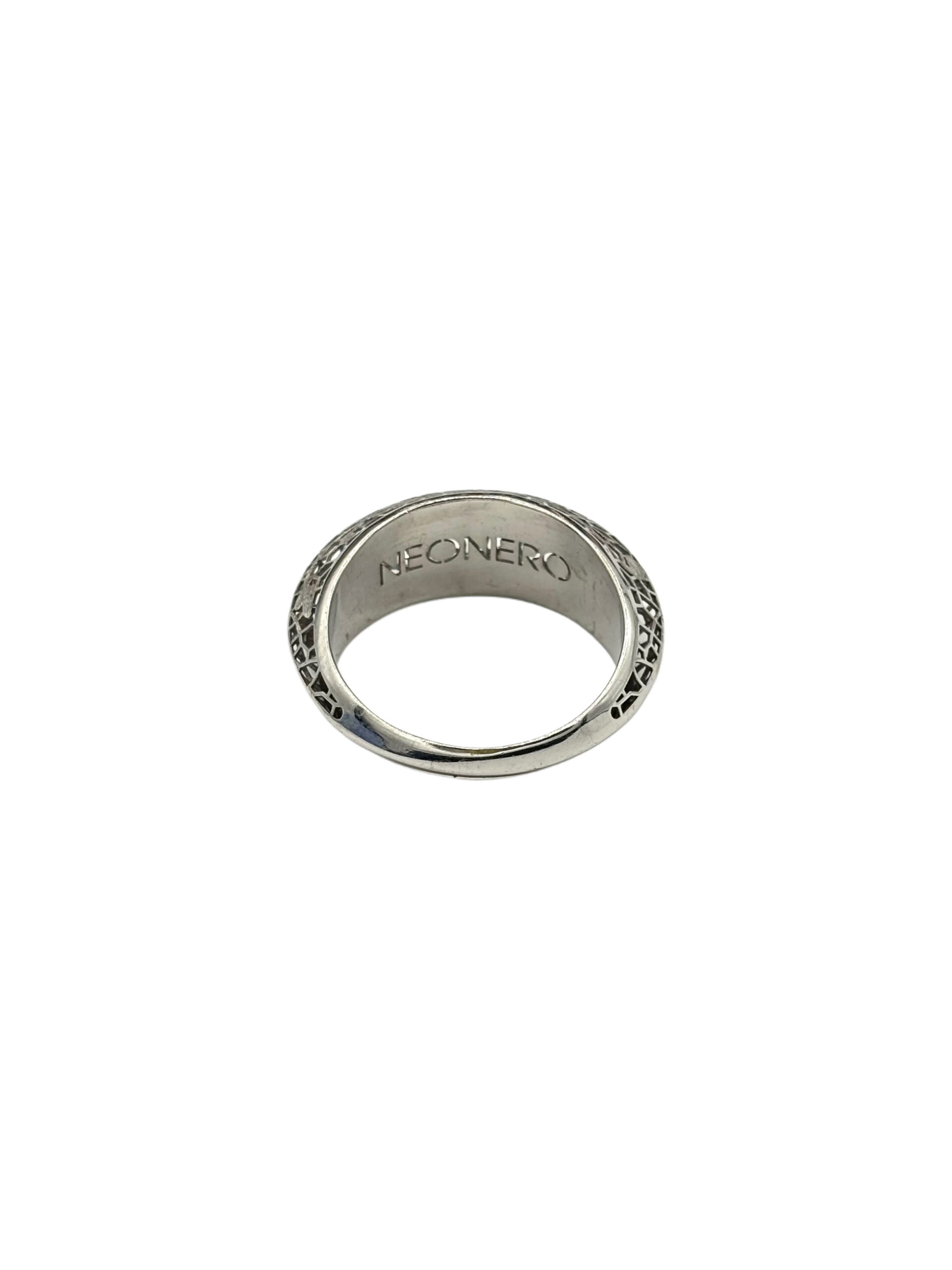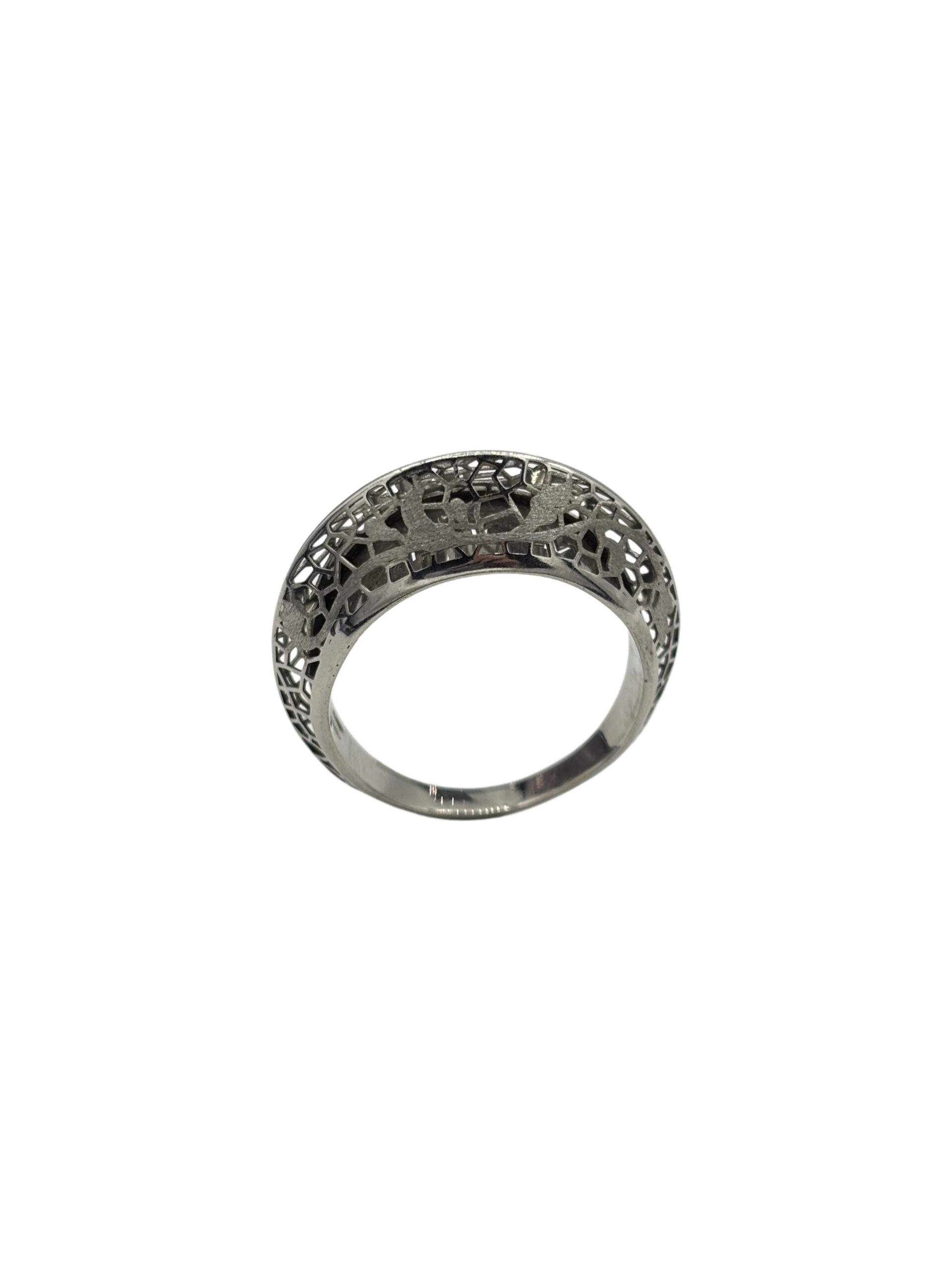 Prsten z bílého zlata se širokou obroučkou zdobenou jemným krajkovým výřezem. Precizní zpracování a vzdušný design dodávají šperku elegantní a zároveň originální vzhled. Výrazný doplněk pro každodenní nošení i slavnostní příležitosti.