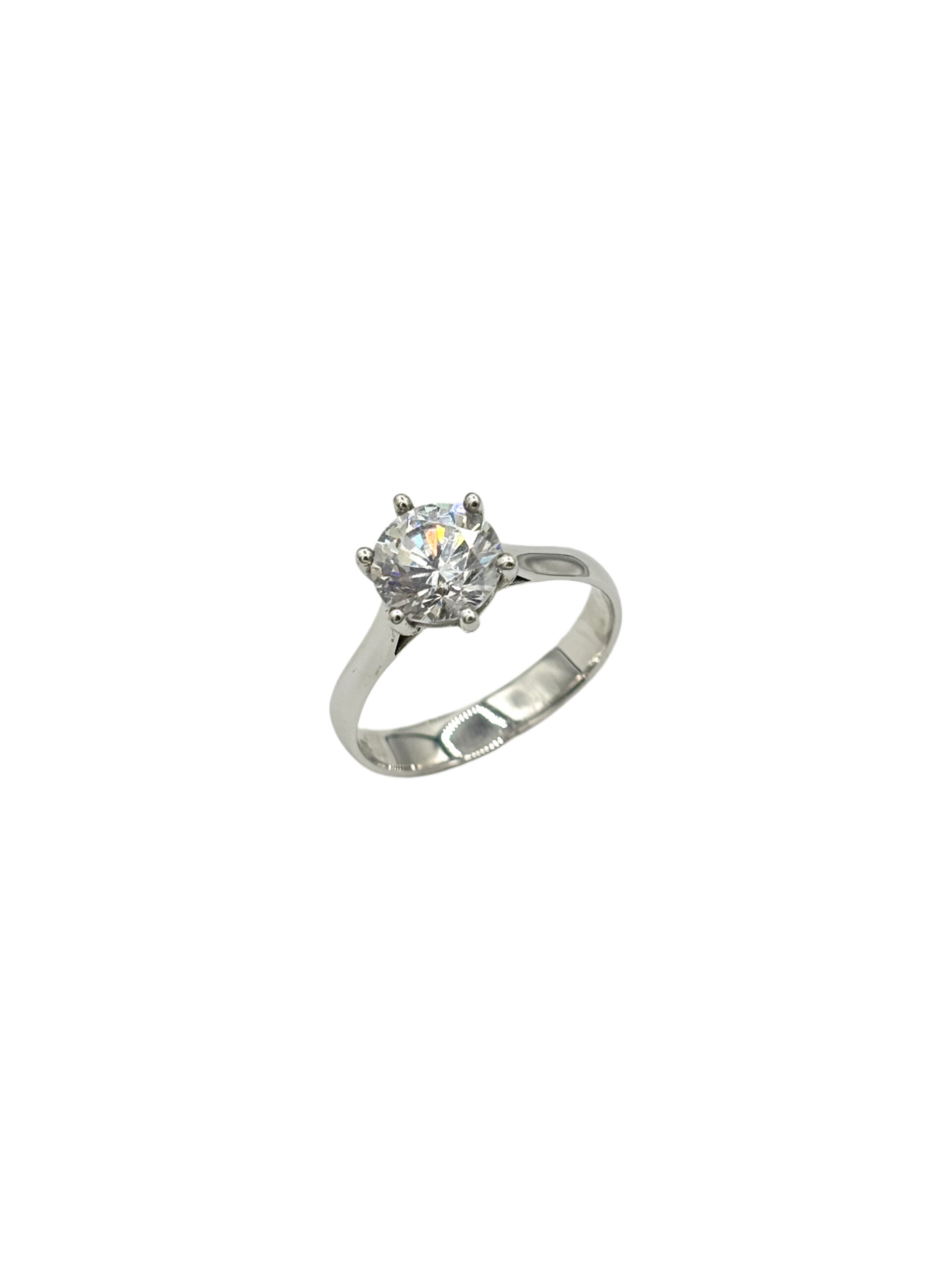 Klasický prsten z bílého zlata s dominantním kulatým zirkonem uchyceným v elegantní šestikrapnové korunce. Hladká šína nechává vyniknout samotnému kameni, který se krásně třpytí a přitahuje pozornost. Ideální jako zásnubní prsten nebo nadčasový doplněk s výrazným kamenem.