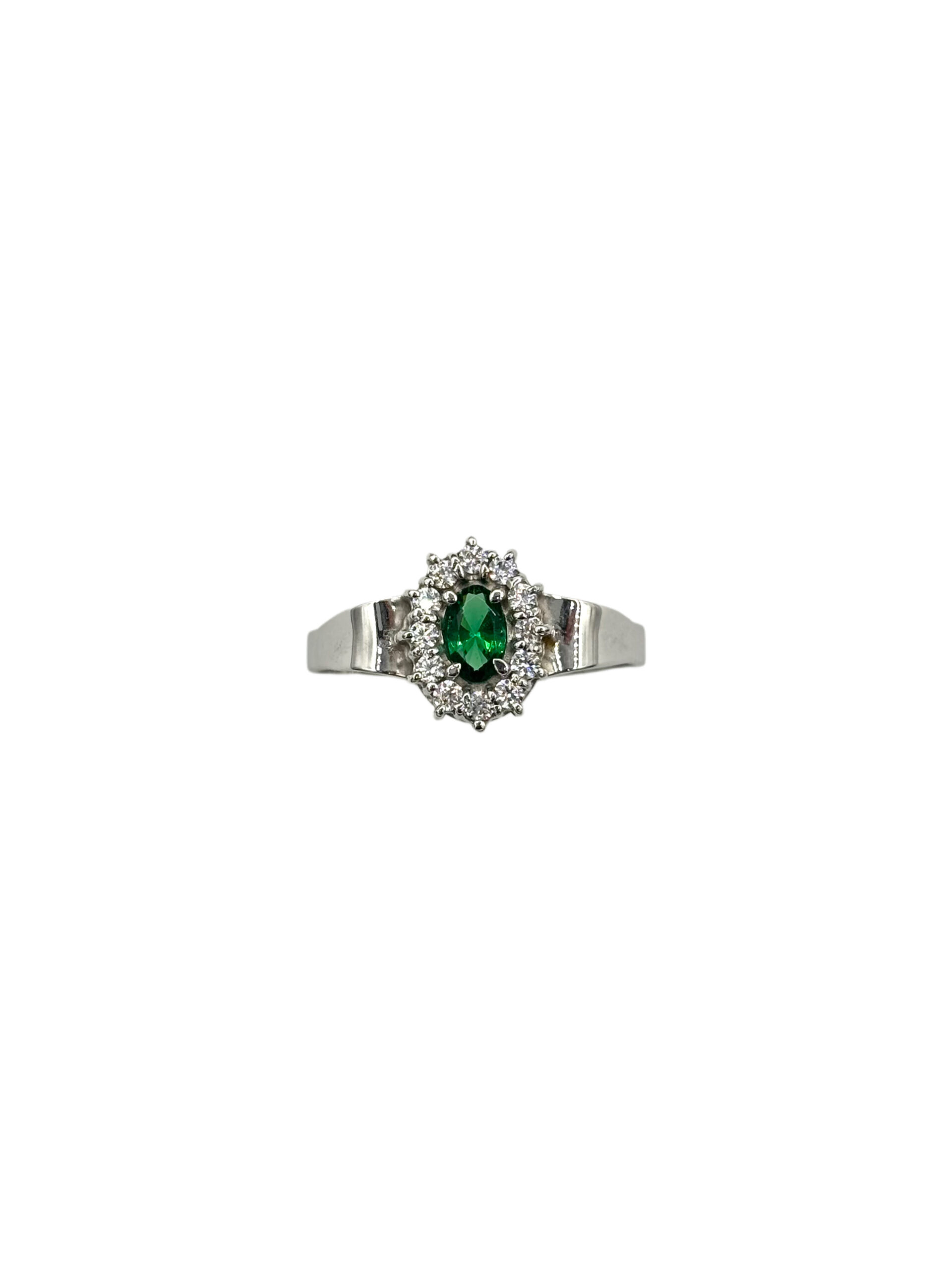 Nápadný prsten z bílého zlata s oválným zeleným kamenem uprostřed, obklopeným jemnými čirými zirkony do tvaru květiny. Šína prstenu se směrem ke středu rozšiřuje a plynule přechází do ozdobného koše. Elegantní šperk s klasickým vzhledem, ideální pro slavnostní příležitosti.