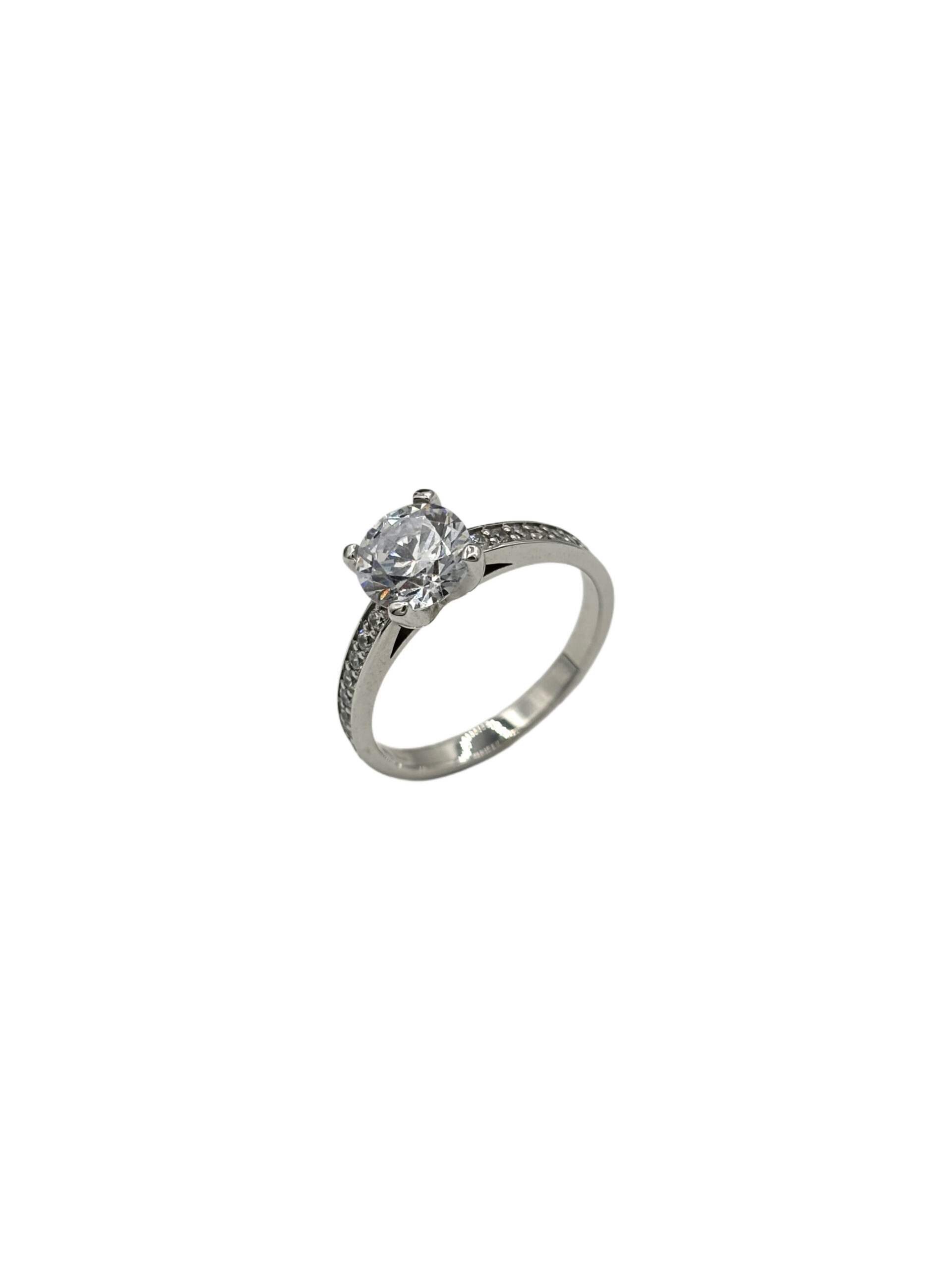 Elegantní prsten z bílého zlata s dominantním kulatým zirkonem uchyceným ve čtyřech krapnách. Lesk hlavního kamene doplňují drobné zirkony zasazené po stranách šíny, které dodávají šperku jemný třpyt z každého úhlu. Ideální jako zásnubní prsten nebo stylový doplněk pro každodenní nošení.