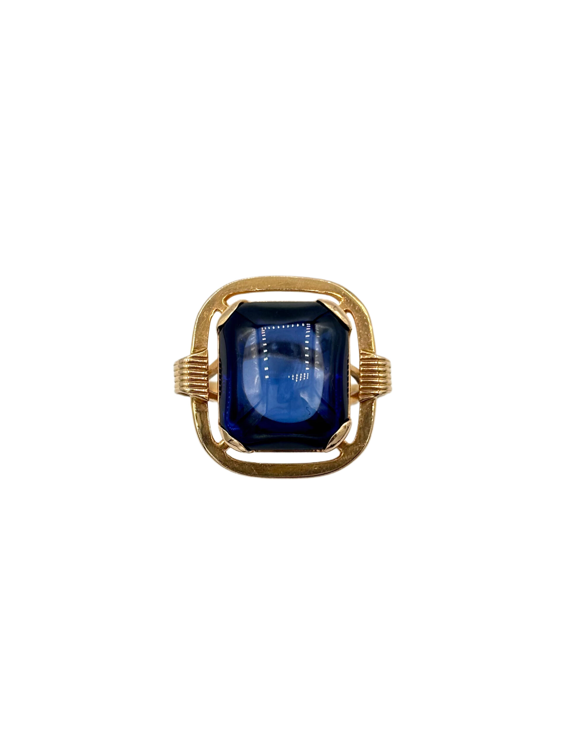 Výrazný prsten z růžového zlata s centrálním modrým kamenem ve čtvercovém cabochonovém brusu. Hladký povrch kamene zvýrazňuje jeho hlubokou barvu a vytváří působivý kontrast se zlatou obroučkou. Decentní zdobení kolem kamene dodává prstenu nadčasový vzhled, který vynikne při každé příležitosti.