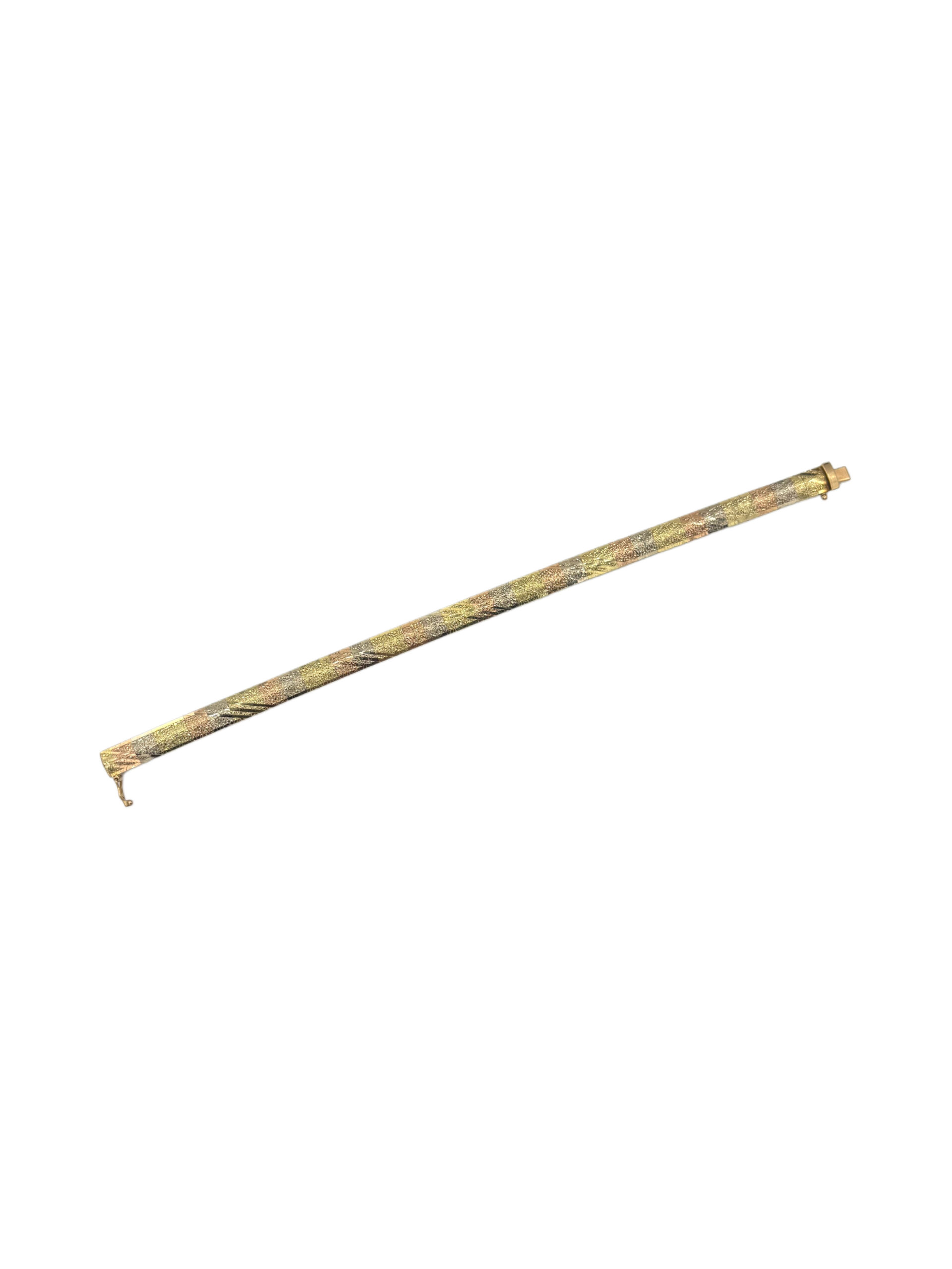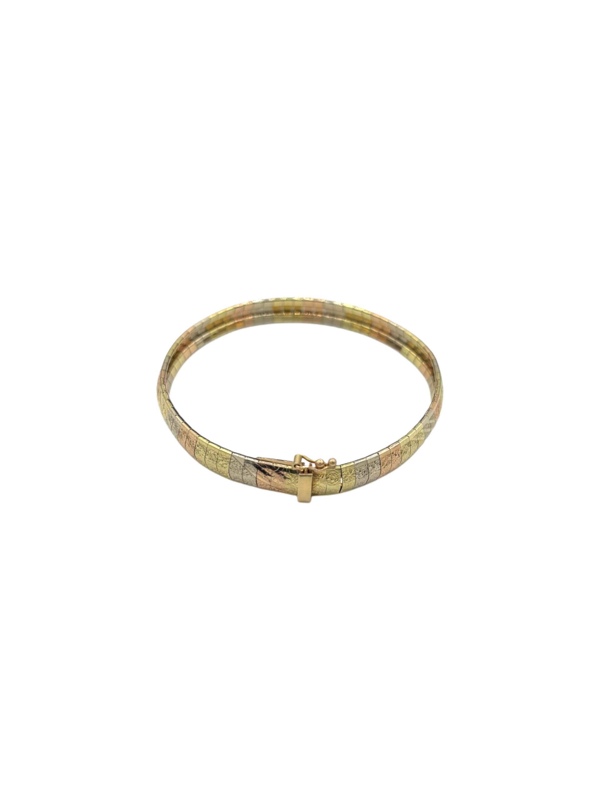 Elegantní náramek z bílého, žlutého a červeného zlata v jemném geometrickém vzoru. Povrchová úprava dodává šperku jemný lesk a decentní texturu. Trojbarevné provedení umožňuje snadné kombinování s dalšími šperky a doplňky. Náramek je vybaven bezpečnostním zapínáním, které zajišťuje pohodlné a spolehlivé nošení.