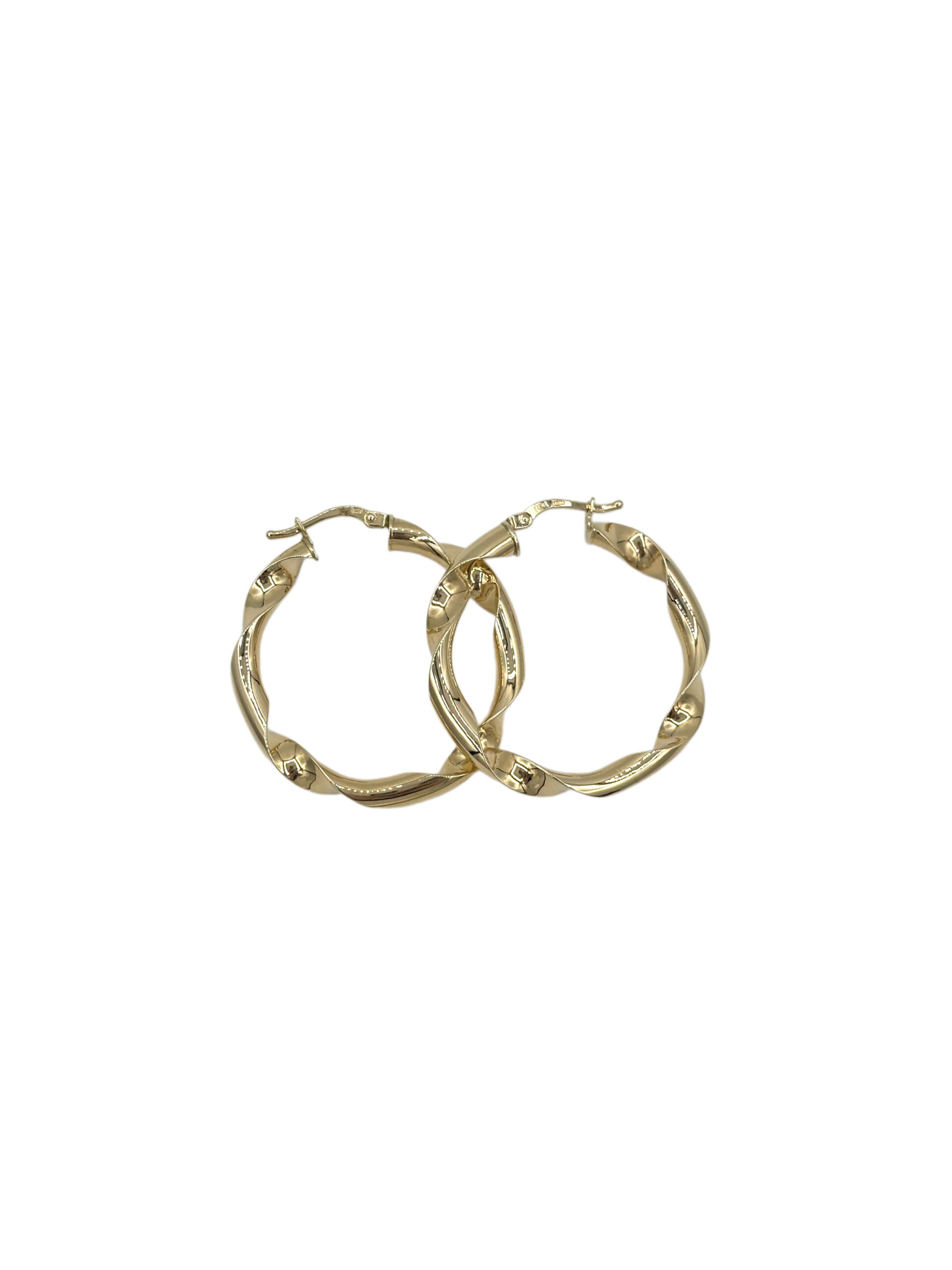Tyto stylové náušnice se zlatým krouceným efektem vynikají elegantním reliéfním zdobením a pohodlným zapínáním. Vhodné pro každodenní nošení i slavnostní příležitosti. Dostupné ve dvou velikostech.