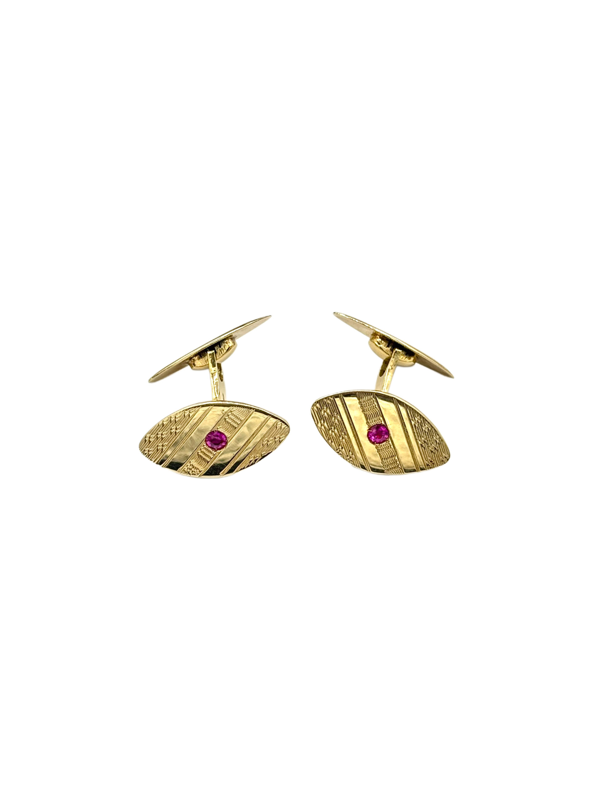 Elegantní manžetové knoflíčky ze žlutého zlata s oválnými hlavicemi, které zdobí střídavě ryté a lesklé pruhy. Uprostřed každého knoflíčku je vsazen drobný rubín sytě červené barvy, který jim dodává noblesní a zároveň decentně barevný akcent. Perfektní doplněk pro slavnostní příležitosti i každodenní formální styl.