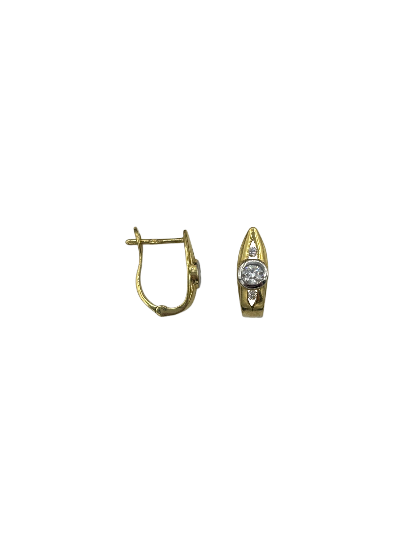 Elegantní náušnice ze žlutého zlata ve tvaru protáhlé kapky, v jejímž středu je zasazen výrazný čirý kámen. Ten je lemován dvěma drobnějšími kamínky, které podtrhují jeho lesk a dodávají šperku jemnou jiskru. Náušnice mají pohodlné zapínání na klapku, které je ideální pro každodenní nošení i výjimečné příležitosti. Tvar náušnic opticky prodlužuje linii ucha a působí velmi vkusně a žensky.