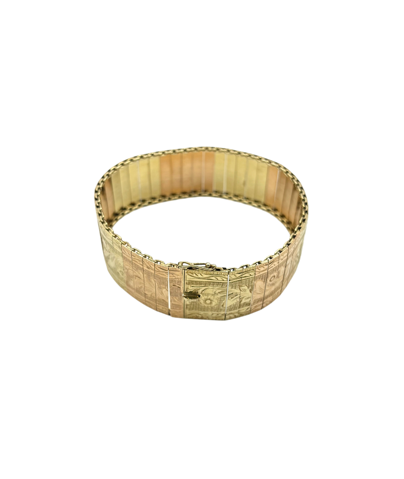 Luxusní široký náramek ze žlutého zlata tvořený souvislým pásem bohaté rytiny s florálním a geometrickým dekorem. Pevná konstrukce zajišťuje pohodlné a bezpečné nošení, zatímco detailní gravírování dodává šperku unikátní a nadčasový vzhled. Výrazný doplněk, který vynikne při slavnostních příležitostech i jako sběratelský klenot.