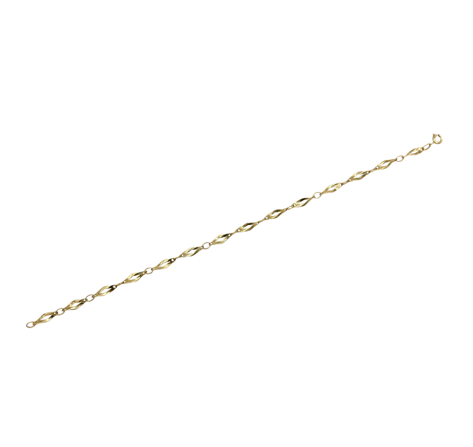 Tento elegantní zlatý náramek zaujme svým originálním provedením – články jsou jemně kroucené, což vytváří zajímavý lesklý efekt při pohybu. Je ideální volbou pro ženy, které hledají decentní, ale přesto výjimečný šperk pro každodenní nošení i slavnostní příležitosti.