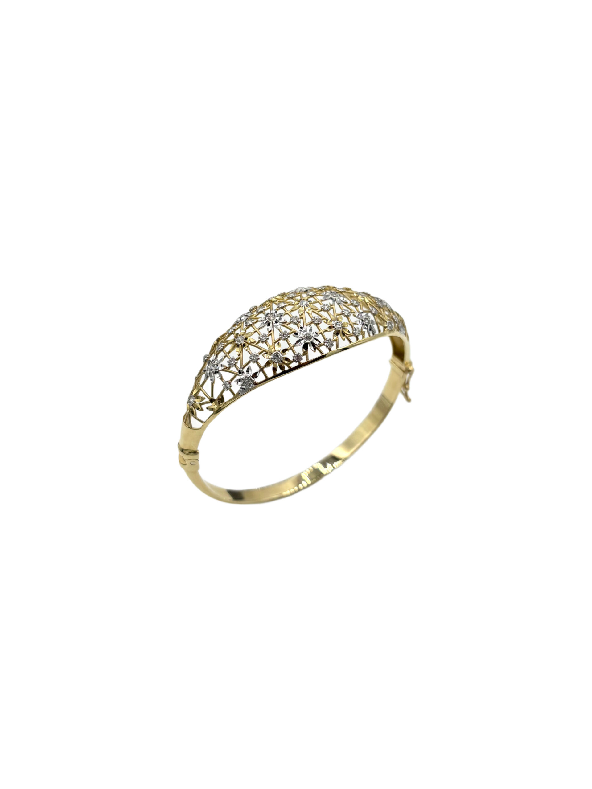 Elegantní náramek ze žlutého zlata zdobený jemným síťovým vzorem připomínajícím květinovou krajku. V jednotlivých kvítcích jsou vsazeny třpytivé zirkony, které dodávají šperku jemný lesk a luxusní vzhled. Díky bohatému provedení je náramek výrazným doplňkem pro slavnostní příležitosti, ale skvěle vynikne i při elegantním denním nošení.