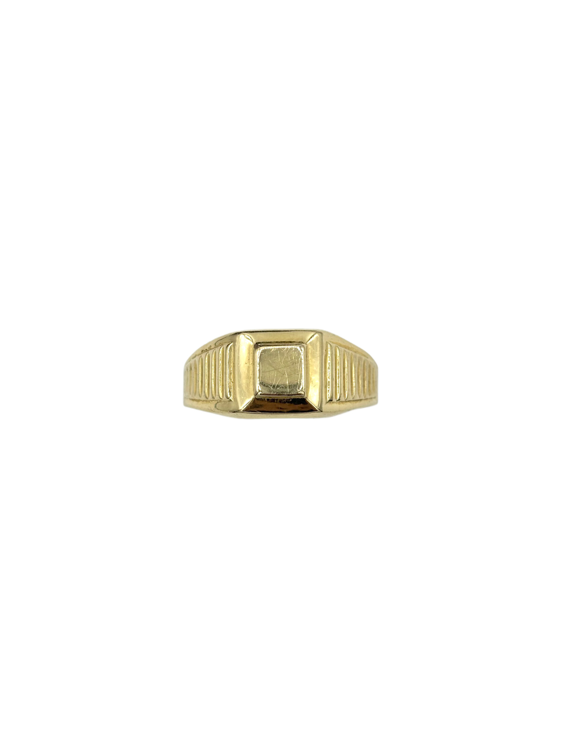 Klasický pánský pečetní prsten ze žlutého zlata s výraznou rytinou po stranách a hladkou obdélnou destičkou uprostřed. Prsten kombinuje elegantní lesk s decentními geometrickými liniemi, které mu dodávají nadčasový charakter. Vhodný jako osobní šperk nebo jako dárek s možností gravírování iniciál.