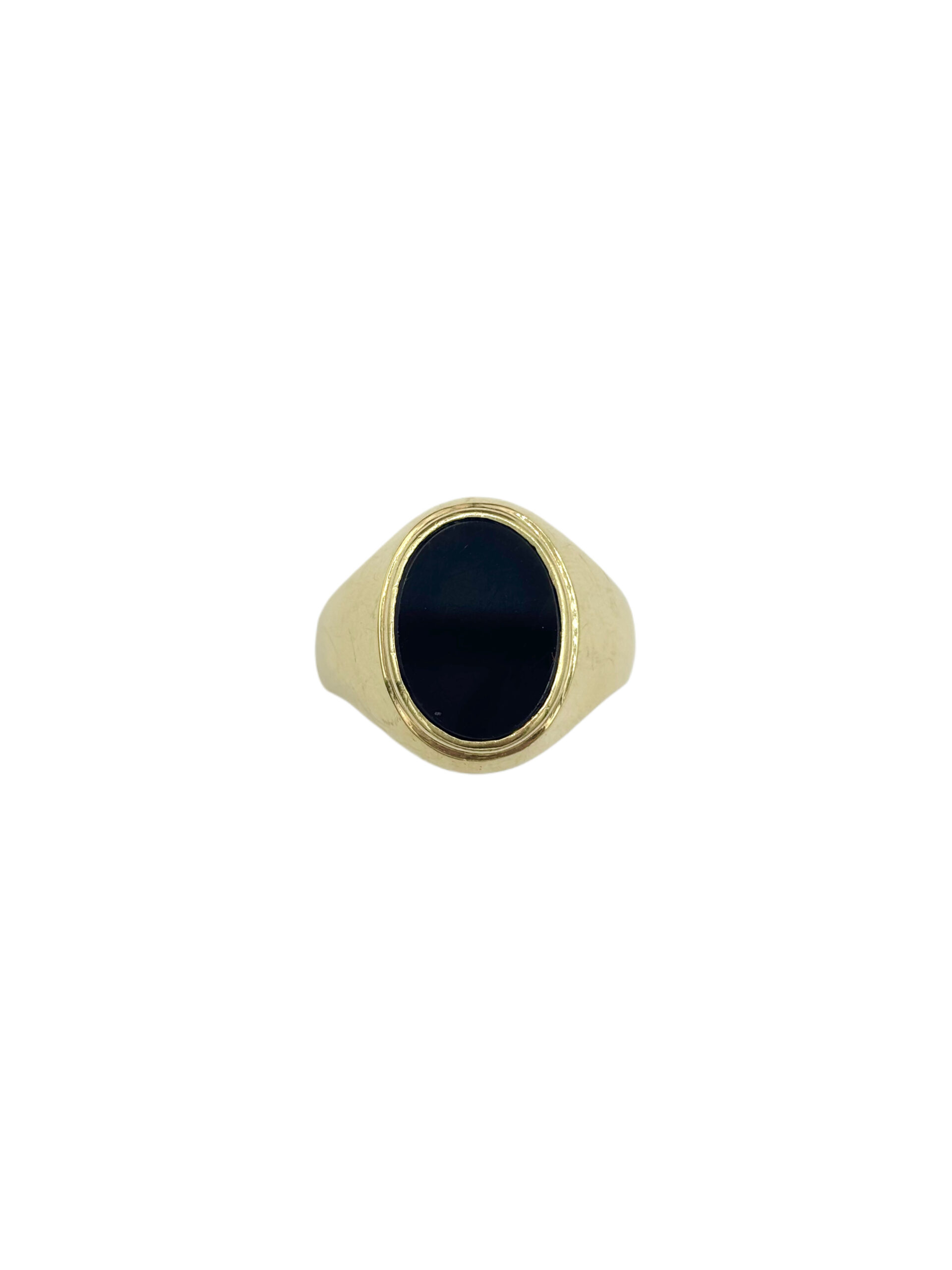 Masivní pánský prsten ze žlutého zlata s dominantním oválným černým onyxem. Čisté linie a lesklý povrch zlata kontrastují s temným kamenem, což dodává šperku výrazný charakter. Ideální volba pro muže, kteří hledají šperk s osobitostí a silným vizuálním dojmem.