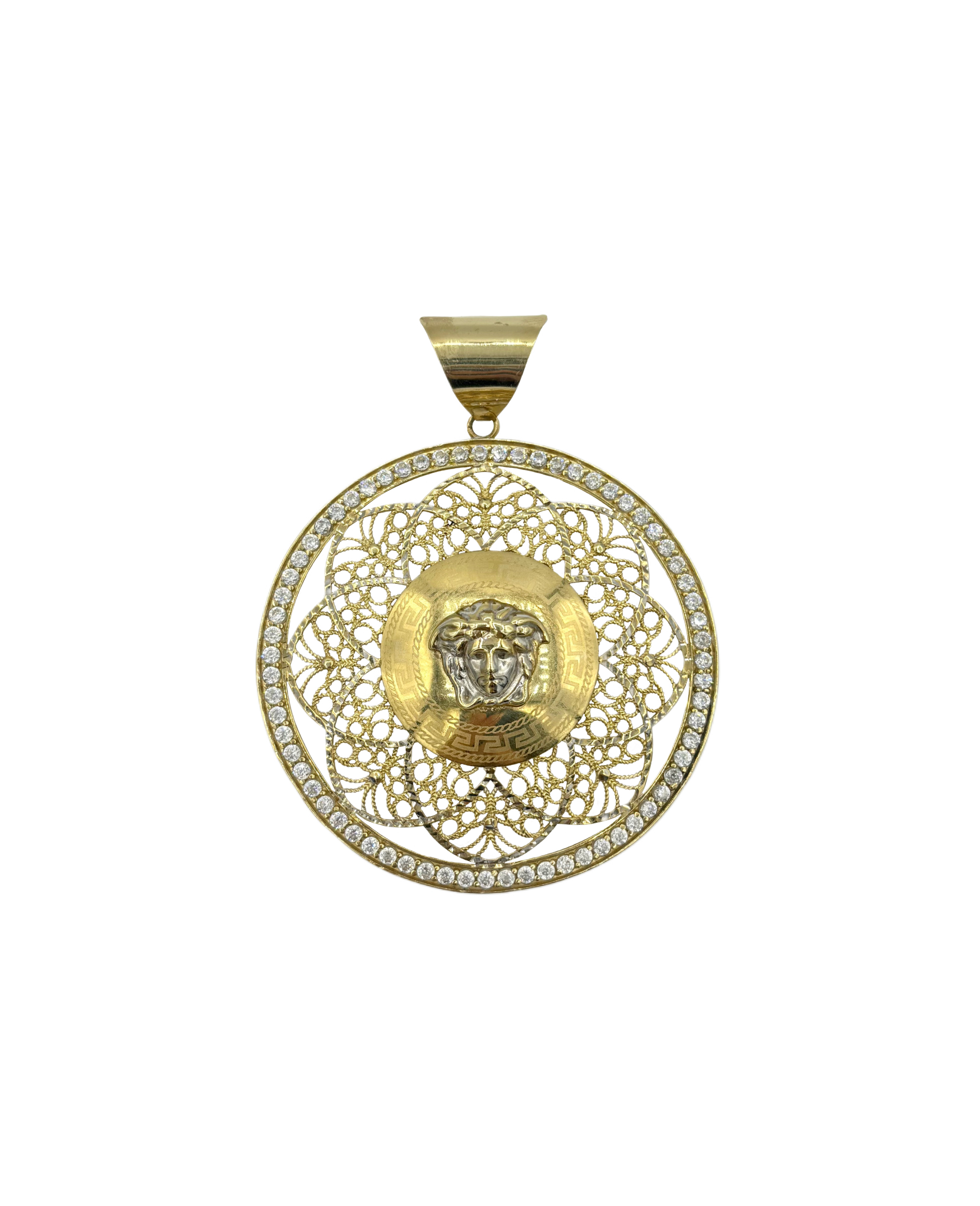 Elegantní kruhový přívěsek ze žlutého zlata zaujme bohatým filigránovým zdobením a třpytivým okrajem osazeným čirými kameny. Ve středu se nachází plastický motiv hlavy, který dodává šperku výrazný a luxusní charakter. Díky preciznímu zpracování a detailům je přívěsek vhodný jako dominantní doplněk, který podtrhne osobitý styl nositele.