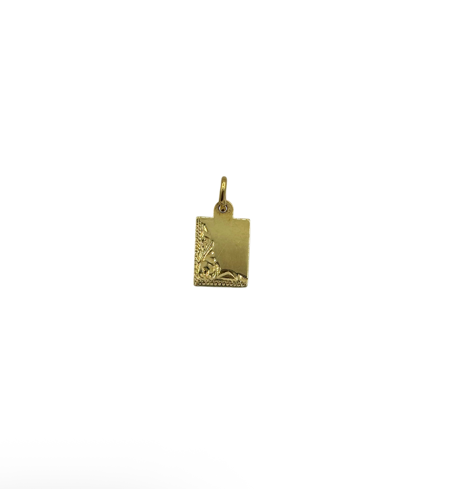 Elegantní a decentní přívěsek ve tvaru obdélníku vyrobený ze 14 karátového žlutého zlata. V levém dolním rohu je zdobený jemným gravírováním květinového motivu, který mu dodává jemný nádech luxusu a originality.