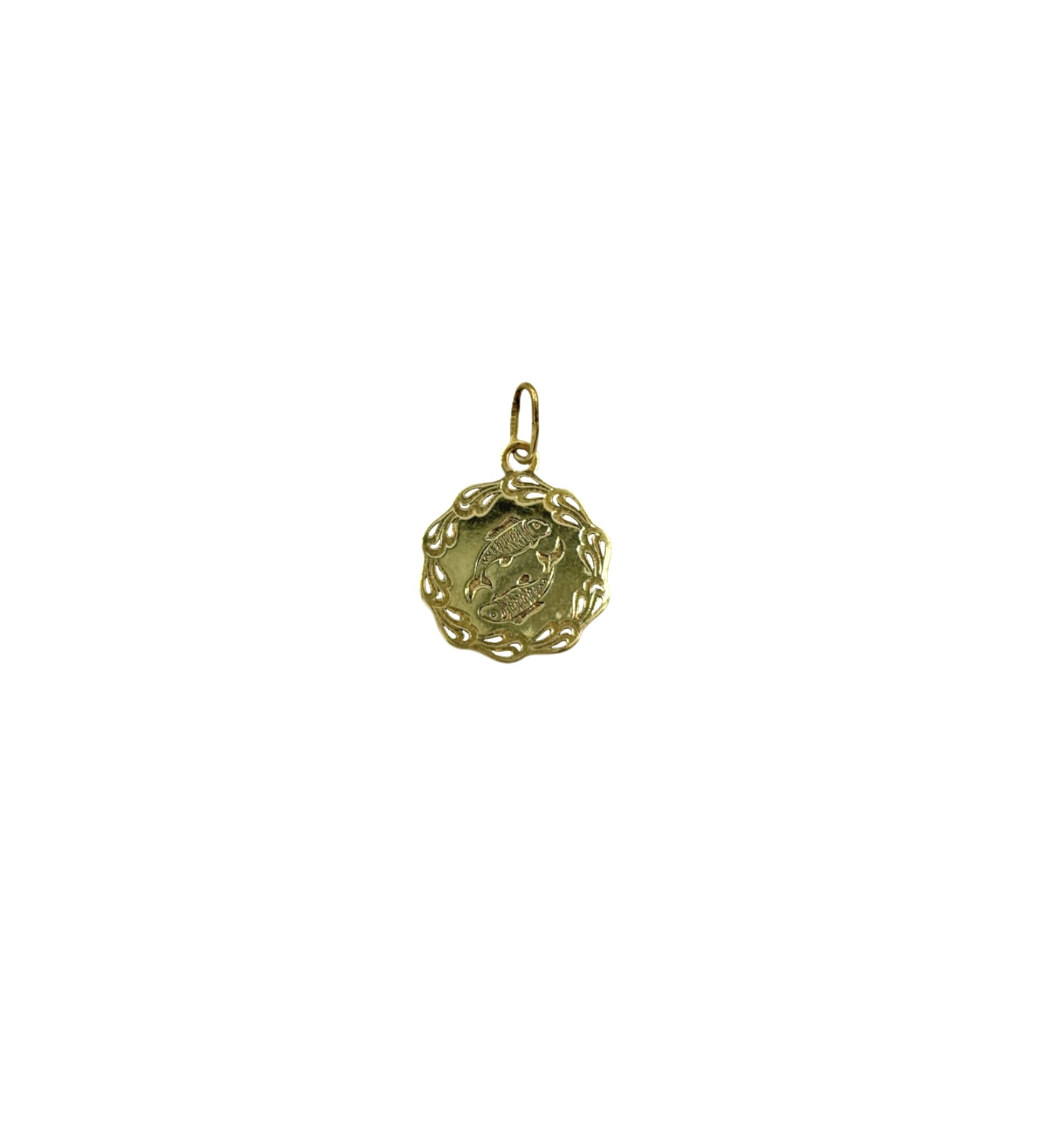 Tento krásný kulatý přívěsek je vyrobený ze 14 karátového žlutého zlata a zdobený jemným reliéfem znamení Ryb. Okraj přívěsku je dekorovaný ornamentálním motivem, který mu dodává nadčasový a elegantní vzhled.