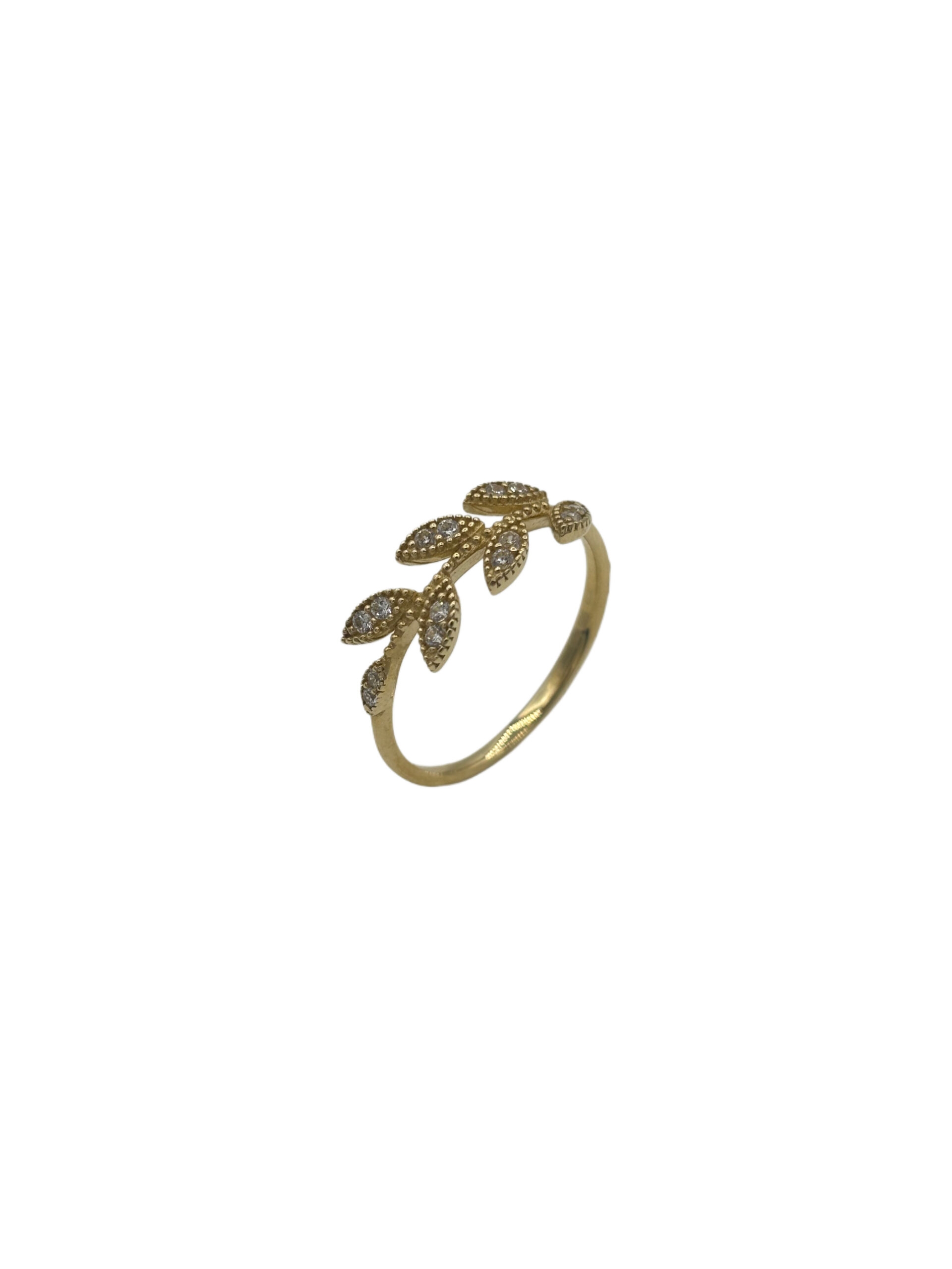 Elegantní zlatý prsten s jemnými lístky, které se rozprostírají podél prstu a jsou osázené drobnými čirými zirkony. Design připomíná přírodní ratolest a nese v sobě lehkost, harmonii a ženskost. Ideální pro milovnice přírody i jako romantický dárek se symbolikou růstu a života.