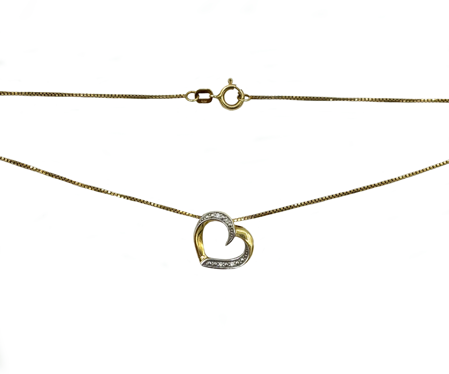Elegantní náhrdelník ze žlutého zlata s přívěskem ve tvaru otevřeného srdce, který spojuje něhu a jemnost. Polovina srdce je osázena drobnými brilianty, které dodávají šperku jemný lesk a romantický nádech. Přívěsek je zavěšen na jemném zlatém řetízku, který působí lehce a decentně.